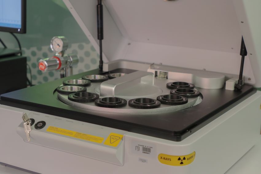 El laboratorio cuenta con un equipo de Fluorescencia de Rayos X modelo Epsilon 3xle de la casa Panalytical, con una sensibilidad de hasta 1 ppm y un rango de análisis de elementos desde el sodio (Na) hasta el uranio (U). El equipo puede medir muestras en polvo suelto, perlas, láminas, sólidos y líquidos.